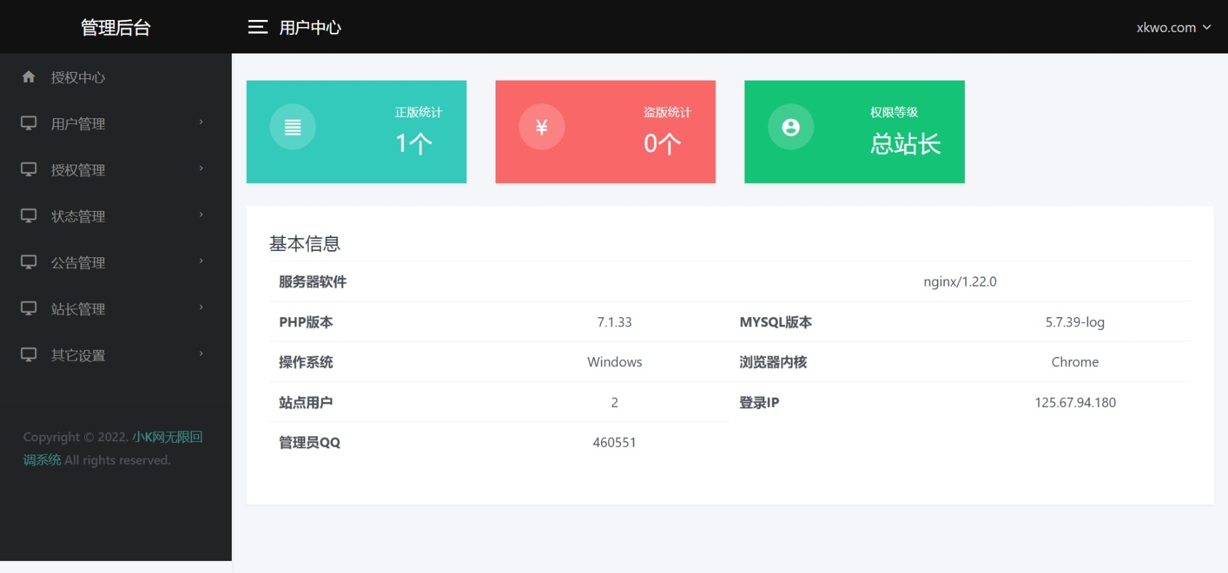 | 最新修复版本的微信公众号无限回调系统,无限授权域名,该版本去除了已知的后门! 适用于需要微信公众号进行授权登录的网站、h5 系统! 解决一个微信认证服务号,对接多个应用系统进行微信授权登录的限制 解决没有认证服务号且项目中需要微信授权登录的问题!!! 运行环境:php 7.2 mysql 5.6 ngnix 1.24 1、创建站点上传源码并解压到根目录 2、创建数据库上传数据库文件并导入 3、修改数据库配置:/config.php 4、根目录 api.php 修改为自己的域名 5、根目录授权代码.php 修改为自己的域名 账号密码:xkwo.com 7、易支付对接目录:EPay/config.php 公众号配置: 在微信公众平台中配置域名 (配置域名时需要下载 txt 放到站点中,根据公众号提示即可)、设置服务器白名单进入后台管理界面中配置网站信息以及 公众号信息 (公众号名称、id、秘钥) 用户使用: 在系统首页注册用户,登录到用户端后台,在域名授权中提交自己需要授权的域名然后在自己的项目中配置页面上提供的接口地址、appid、公众号秘钥即可 需要使用回调的网站源码里面找到官方回调地址:(替换为回调系统的回调接口地址) 公众号官方回调地址:open.weixin.qq.com/connect/oauth2/authorize(替换问号前面的地址) 下载声明: 本站部分资源来自于网络收集,若侵犯了你的隐私或版权,请及时联系我们删除有关信息。 本站提供的一切软件、教程和内容信息仅限用于学习和研究目的;不得将上述内容用于商业或者非法用途,否则,一切后果请用户自负。本站信息来自网络,版权争议与本站无关。您必须在下载后的 24 个小时之内,从您的电脑或手机中彻底删除上述内容。如果您喜欢该程序,请支持正版,购买注册,得到更好的正版服务。如有侵权请邮件 QQ 邮箱:suyanw520@163.com 与我们联系处理。敬请谅解! 下载地址: 文件地址 |