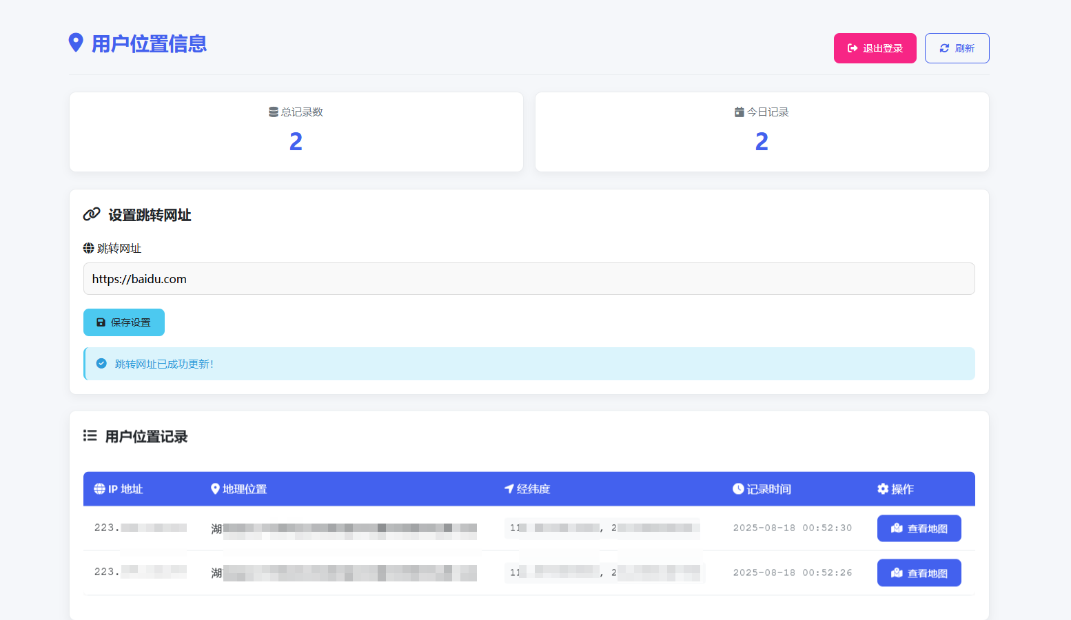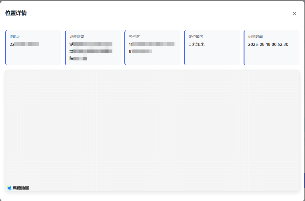 | 一款能够获取网站访问者 ip 的程序,通过链接访问可提取访问者 ip 定位,链接可自定义设置跳转目标网站,实测定位误差 1 公里之内,带后台无需数据库 测试环境:PHP7.4 定位接口对接的是高德 key 不好的点是获取定位不是静默获取,点进网页之后会有弹窗提示是否获取定位,如果点拒绝是无法打开对应的目标地址的,点允许就可以正常跳转目标地址 可以做成微信卡片发送,效果会好一些 |
