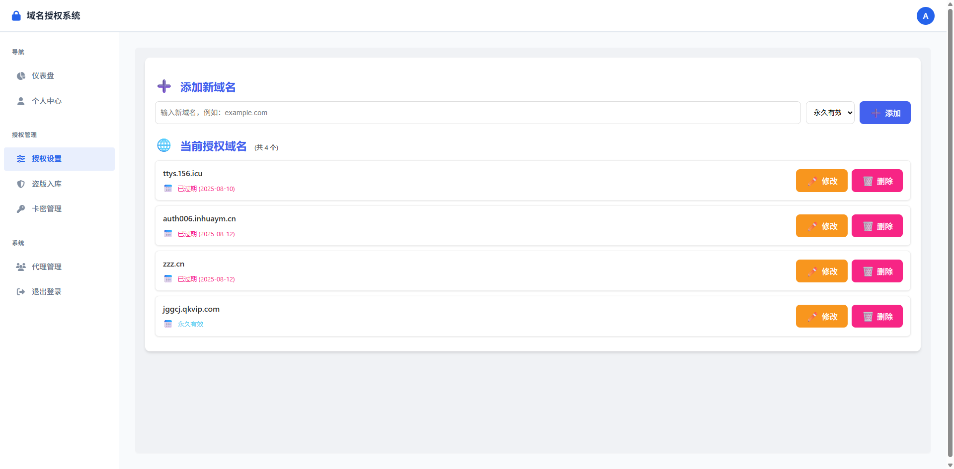 前台支持自助更换授权,可批量生成,支持自定义设置到期时间