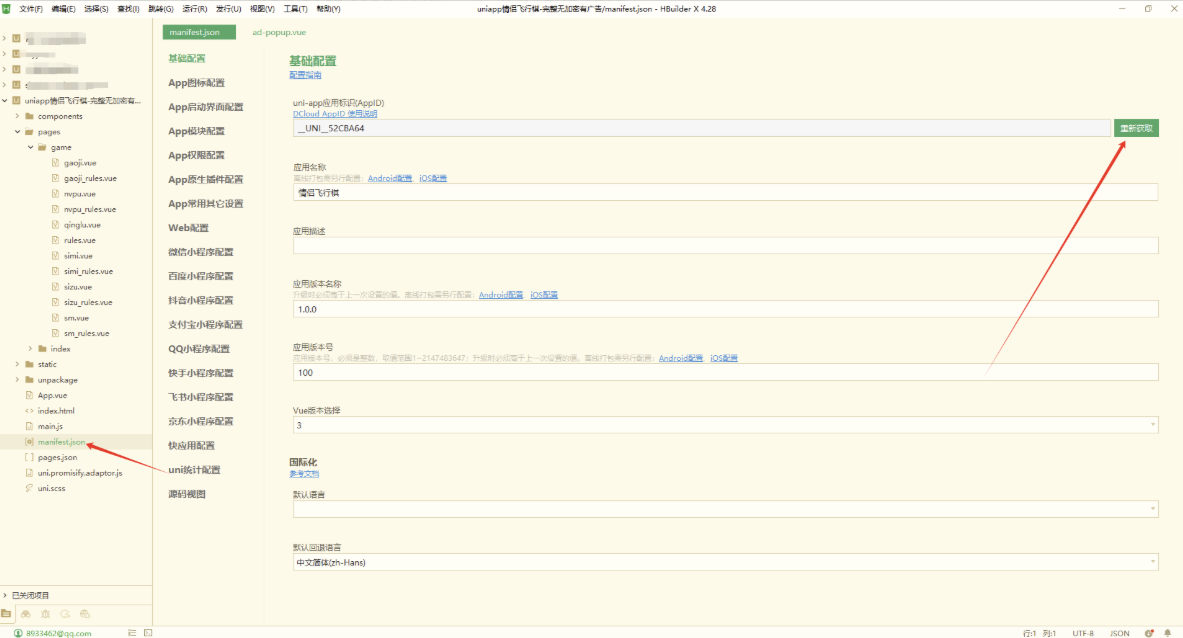 5. 点击 manifest.json 文件,重新获取 appid