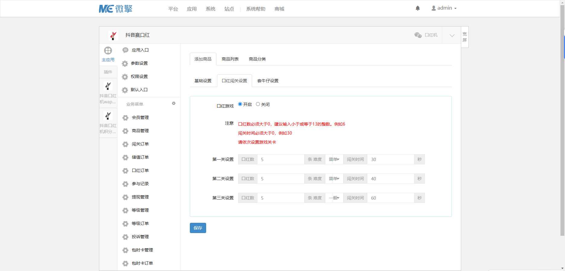 | 对比上个版本,修复了闯关成功之后奖品无法发放的问题,功能全部都测试了可以正常运营,使用微擎系统 测试环境:MySQL5.6,PHP5.6 支付对接的易支付,默认对接的微信接口 登录支持浏览器打开和微信内服务号登录,进入页面自动授权微信登录 支持三级分销和三级代理 商品可设置无库存自动下架,支持设置当用户达到最多次数后,将无法挑战该商品 支持商品累计金额达到多少才能有挑战成功 关卡支持自定义设置口红数量和挑战时间 带有投诉功能,可有效拦截用户投诉 支持新用户注册赠送余额 支持邀请赠送余额,每天可限制有效邀请数量 文件存储支持本地和七牛云