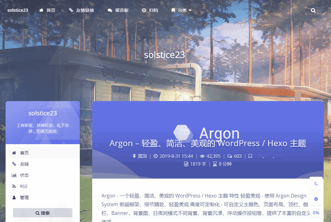Argon 主题 – 一个轻盈、简洁、美观的 WordPress 主题。主题特性